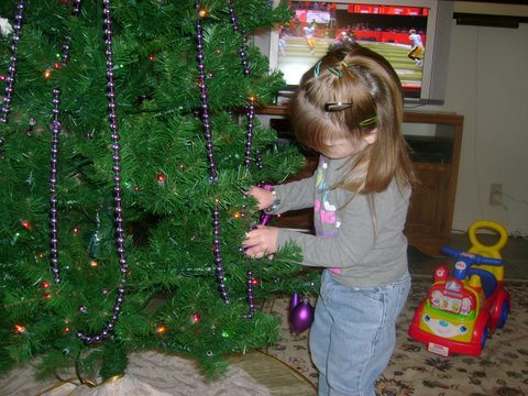 Mena helped Grandma decorate for Christmas when she spent the night. This is what Grandma said about decorating together: "When I set up the nativity, I handed Mena the pieces, and she put them up. The animals are in front, Joseph is facing away from Mary & baby Jesus, and the Wise Men are not together. I told her that the sheep didn't usually stand up so if they laid down that was okay. When she put baby Jesus in, she said, "He lays down right?" She loved putting the ice cycles on better than the purple glass balls. She also liked putting 2-3 ice cycles together!! It was fun having a kid to help me decorate again!"
